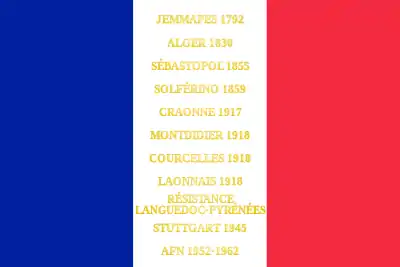 Jemmapes 1792 Alger 1830 Sébastopol 1855 Solférino 1859 Craonne 1917 Montdidier 1918 Courcelles 1918 Laonnais 1918 Résistance Languedoc-Pyrénée Stuttgart 1945 AFN 1952-1962 |