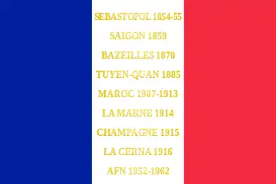 Sébastopol 1854-55 Saïgon 1859 Bazeilles 1870 Tuyen-Quan 1885 Maroc 1907-1913 la Marne 1914 Champagne 1915 la Cerna 1916 AFN 1952-1962 |