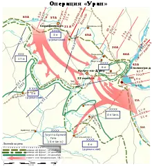 Le au matin, sous un brouillard givrant, le front du Sud-Ouest attaque sur 56 km de large à partir de la tête de pont de Serafimovitch : l'artillerie prépare le terrain pendant 75 minutes, puis l'infanterie d'assaut et ses chars d'accompagnement percent un trou de 22 km de large à travers les premières lignes de la 3e armée roumaine[7]. Les corps d'exploitation sont ensuite introduits dans la brèche, franchissant dans la foulée la seconde ligne roumaine (peu étoffée) et foncent en parallèle plein sud puis sud-est, faisant 15 km dès le premier jour : le 8e corps de cavalerie atteint la Tchir à Tchernikovskaïa[8] le 21 et Osinovski ; le 1er corps de chars va jusqu'à Sourovikino sur la Tchir puis Rijkov sur le Don ; et le 26e corps de chars prend successivement Dobrinka et Ostrov le 21, puis le pont de Kalatch-sur-le-Don le 22 au petit matin[9] (après avoir franchi 128 km), flanc-gardée par le 4e corps de chars (de la 21e armée).