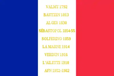 Valmy 1792 Bautzen 1813 Alger 1830 Sébastopol 1854-55 Solférino 1859 La Marne 1914 Verdun 1916 L'Ailette 1918 AFN 1952-1962 |
