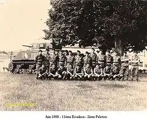 À noter que, malgré la possibilité offerte depuis 1983 aux jeunes filles volontaires d’effectuer un service national, aucun personnel féminin appelé n’est arrivé au régiment. Les engagées se comptent par ailleurs sur les doigts d’une main, toutes affectées à l’escadron de commandement et des services. Hormis le capitaine Guillon, médecin adjoint (1988-89), la plus haute gradée est l’adjudant Jaggi, à l’état-major.