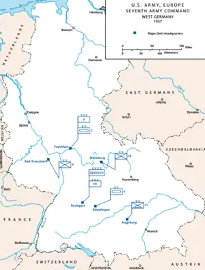 En , l'USAREUR et l'état-major de la 7e armée furent combinés pour devenir l’US Army Europe / Seventh Army. Dans le même temps, la France se retira de la structure militaire de l'OTAN et les forces américaines furent retirées de France. Le QG des communications fut déplacé d'Orléans à Worms (Allemagne), et plus tard à Kaiserslautern. l'USEUCOM déménagea à Stuttgart. Le premier redéploiement de troupes présentes en Allemagne se déroula en 1968, avec la suppression de près de 28 000 militaires.