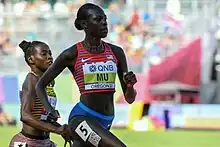 En , lors des championnats du monde de Moscou, la Kényane Eunice Sum crée la surprise en parvenant à devancer toutes les favorites. Elle s'impose en finale dans le temps de 1 min 57 s 38, devant Mariya Savinova (1 min 57 s 80) et l'Américaine Brenda Martinez (1 min 57 s 91)[44]. Elle devient à cette occasion la deuxième athlète kényane après Janeth Jepkosgei en 2007 à remporter le titre mondial sur la distance[45]. La disqualification pour dopage de Mariya Savinova en 2017 entraîne un changement de médaillées : Brenda Martinez récupère l'argent et Alysia Johnson-Montaño le bronze.