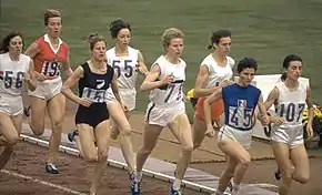 L'épreuve du 800 mètres féminin fait sa première apparition olympique lors des Jeux de 1928 à Amsterdam. L'Allemande Lina Radke remporte le titre et améliore de près de trois secondes son propre record du monde en 2 min 16 s 8, devançant la Japonaise Kinue Hitomi et la Suédoise Inga Gentzel[42]. Mais, jugée trop difficile pour les femmes après que certaines concurrentes se soient allongées sur la piste après la course afin de récupérer, l'épreuve est retirée du programme olympique, les membres du Comité international olympique estimant que les femmes étaient trop fragiles pour courir une distance aussi longue[43]. Ainsi, aucune course féminine supérieure à 200 m ne sera disputée dans le cadre des Jeux olympiques avant 1960.