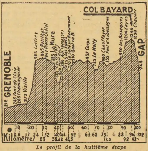 Après le sommet, la course rejoint Pierre-Châtel, La Mure, La Salle-en-Beaumont, Corps et passe dans le département des Hautes-Alpes à Chauffayer. L'ascension du col Bayard débute au pont d'Aubessagne, en passant par Les Basaques et Laye.