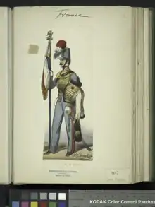 - Gilet composé de 3 rangée de bouton sous la révolution puis 5 rangée sous l'Empire couleur rouge vif, bouton argenté, brandebourg blanches