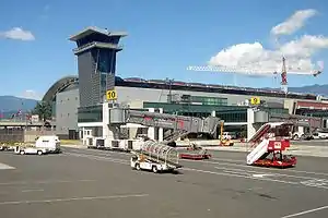Terminal (portes 9 et 10) et tour de contrôle de l'aéroport Juan-Santamaria.