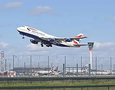 Un Boeing 747 de British Airways décolle depuis la piste 27L; la tour de contrôle est en arrière plan