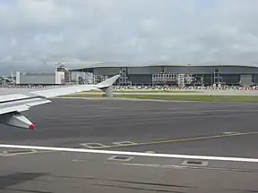 Vue aérienne du Terminal 5B (à gauche) et du Terminal 5 (au centre)