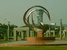 Un emblème de l'aéroport. Derrière, on peut voir la tour de contrôle.