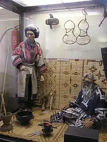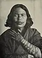 - Pendant qu'ils boivent lors d'une cérémonie, les hommes relèvent leur moustache avec un instrument en bois de saule[Note 3].