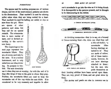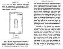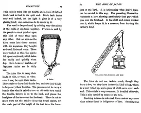 Le Révérend John Batchelor décrit l'aménagement intérieur des cases en détail et dessine un plan minutieux avec la répartition des espaces intérieurs[31]. L'élément le plus important est le foyer central au-dessus duquel est suspendue une sorte de broche pour faire griller la viande ou le poisson. Les outils ou objets importants sont installés sur les poutres. Les hommes et les femmes dorment dans deux espaces séparés, sur des bancs protégés par des nattes suspendues. La maîtresse de maison a un petit coffre avec ses bijoux. Les visiteurs s'assoient sur des nattes en roseaux posées sur le sol et non des tabourets[Note 4].