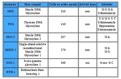 - Uracile-ADN glycosylase (chez les procaryotes et les eucaryotes), supprime l'uracile de l'ADN.