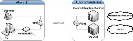 Le signal ADSL transite sur la paire cuivrée téléphonique au même titre que le signal téléphonique, et la cohabitation de ces deux types de signaux requiert l'installation de filtres destinés à séparer les fréquences respectives des deux flux. Au niveau de l'autocommutateur public, ces filtres sont installés sous la forme d'armoires de filtrage qui regroupent plusieurs centaines, voire plusieurs milliers de cartes électroniques de filtrage. Chez l'abonné, la séparation des deux flux est réalisée au moyen d'un filtre ADSL placé entre la prise téléphonique et la fiche de connexion du téléphone.