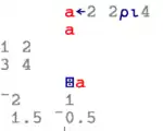 - ⎕←A←2 2⍴⍳4 ⍝ imprime une matrice A de taille 2x2 constituée des nombres de 1 à 4