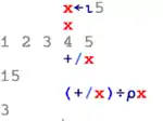 - De même qu'une primitive agit sur des opérandes, un opérateur agit sur des primitives. Ainsi l'opérateur / (reduction) compose la primitive qui le précède sur la totalité d'un vecteur. Par exemple +/X effectue la somme de tous les éléments de X, x/X leur produit, etc., ce qui correspond en algèbre aux signes sigma et pi.