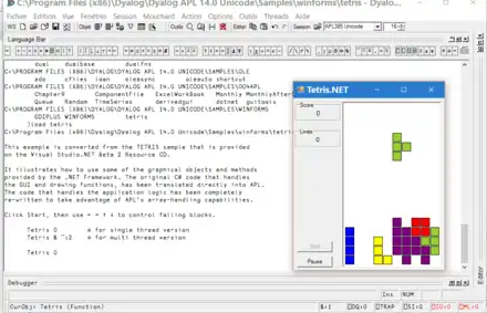| Implémentations | APL\360 APL\1130 APL*Plus Sharp APL APL2 Dyalog APL NARS2000 APLX GNU APL | |