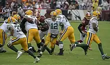 Le QB Aaron Rodgers (no 12) cédant le ballon à Jones en 2018.
