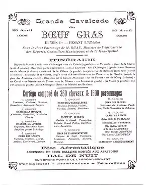 Les et , la Promenade du Bœuf Gras a lieu au départ dans le quartier des abattoirs de la Villette[9]. Ce sont ses dernières sorties avant le début de la renaissance du Carnaval de Paris en 1993 et le défilé du Bœuf Gras de .