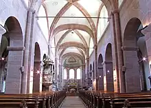 L’église adopte un plan basilical sans transept, la nef et le chœur partageant la même disposition en plan, avec un vaisseau central, constitué de travées doubles, et des bas-côtés. Les quatre travées de la nef sont ainsi naturellement prolongées par de la travée du chœur, seules trois marches séparant les deux espaces, avant de s’achever par une abside au centre et des absidioles sur les bas-côtés. L’ensemble de l’église est voûté, de croisées d’ogives torique pour le vaisseau central, d’arêtes pour les bas-côtés et en cul-de-four pour les absides. Les variations dans le traitement de l’élévation permettent de distinguer trois espaces, dont les fonctions liturgiques étaient différentes[7],[8].