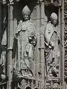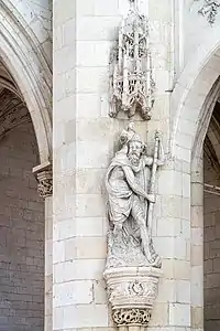 Deux statues majestueuses encadrent l’entrée principale sous la tribune d’orgue : saint Christophe traversant un torrent d’un côté et saint Jacques le Majeur de l’autre.