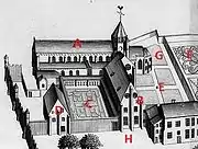 - le cloître jouxte ensuite immédiatement le mur sud de la nef et est bordé à l'ouest par les restes d'un autre bâtiment (D). Entre 1855 et 1947, la façade de la salle capitulaire orne les jardins des thermes de Cluny. Conservée ensuite dans des conditions précaires à Argenteuil, elle est condamnée au rebut en 1963[MG 8].