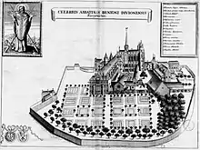 - 1674 - Abbaye Saint-Bénigne vue cavalière par Dom Prinstet, conservée à la Bibliothèque nationale de France ;