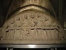 Un autre décorait la porte du cloître donnant accès au réfectoire, décoré de la Cène. Sa réalisation pourrait être placée dans le second tiers du XIe siècle. Assez différent des autres tympans sculptés de l'abbaye, ses sculptures se rapprochent du "relief Crosby" retrouvé à Saint-Denis[12].