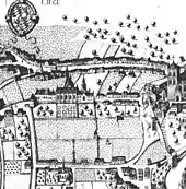 On dit que Charles le Téméraire est entré à Liège par « une brèche entre les portes Saint-Martin et Sainte-Marguerite ». Il faut rappeler que la cité, à l'époque, est protégée par un rempart, et que l'abbaye Saint-Laurent est en dehors de cette enceinte. Le document ci-contre ne date pas de l'époque bourguignonne (gravure de 1626), mais il illustre bien la situation.