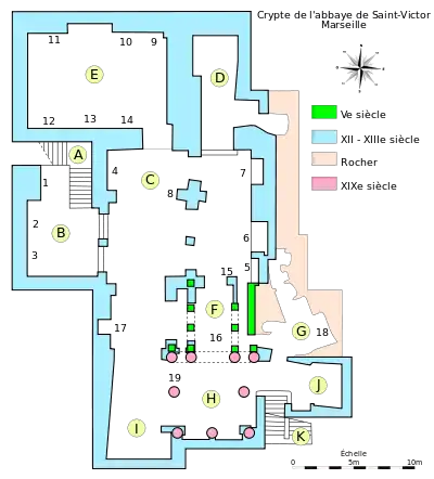 L'Église marseillaise se structure au tout début du IVe siècle ainsi qu'en témoigne la présence d'un évêque de Marseille, Oresius, au Concile d'Arles en 314. L'un de ses successeurs, Proculus ou Procule (380-430), construit un bâtiment constitué par l'actuelle chapelle Notre-Dame de la Confession et l'Atrium et qui sera transformé au XIe siècle en crypte par l'édification de l’église abbatiale. L'axe général de cette construction est nord-sud, donc perpendiculaire à l'orientation est-ouest de l'église supérieure actuelle. Une restitution de ce monument paléochrétien a été proposée par Michel Fixot[Fixot 2]. Proculus veut ainsi affirmer le rôle prééminent de Marseille face à Arles pourtant principale place religieuse de la province Viennoise, au sein du duché de Bourgogne. Cette rivalité religieuse et politique entre Marseille et Arles va marquer l'histoire de Saint-Victor jusqu'à l'intégration de la Provence dans le royaume de France au XVe siècle, à la mort du roi René.