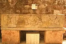 | A- Porche d'entrée | 1- Sarcophage à strigiles et croix au centre |