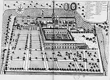 Le monastère, aujourd'hui réaffecté à l'usage de centre de convalescence, et la chapelle. Au premier plan, dans la pelouse, l'on distingue quelques pierres, vestiges de l'ancien monastère. | |