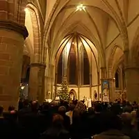 À l’intérieur, les stalles sont baroques. Les baies datent du XVIe, du XVIIIe et du XIXe siècle, ces dernières étant de style néogothique. Les vitraux sont modernes. Le clocher à bulbe est inspiré quant à lui de l'architecture d'Europe centrale.
