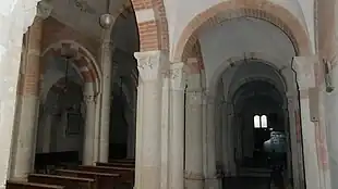 L'église a un plan basilical à trois vaisseaux, la nef est divisée en six travées, avec des arcs et des voûtes soutenues par des colonnes avec des piliers attachés. Le plafond est voûté comme l'église paroissiale de San Lorenzo à Montiglio. Très intéressantes sont les décorations des chapiteaux, élégantes et travaillées dans un style assez recherché, qui ornent les piliers et les colonnes et qui représentent des décorations florales et zoomorphes.
