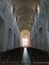 La nef de sept travées a des bas-côtés voûtés d'arêtes séparés par des doubleaux en plein cintre qui sont éclairés par des fenêtres. L'abbaye reprend le plan bénédictin adopté à Bernay avec la nef à trois élévations : arcades, tribunes et fenêtres hautes[33]. En élévation, elle a trois niveaux avec des tribunes peu élevées, avec des ouvertures étroites groupées par deux[34], et un troisième niveau de fenêtres sur l'extérieur avec de petits contreforts. Le transept, encadré par quatre arcs en plein cintre est voûté d'ogives comme les croisillons et porte la tour de plan carré. Dans le croisillon ouest, une tourelle d'escalier permet l'accès à la galerie de circulation et aux combles. Le transept est prolongé d'un chevet avec une abside et un cul-de-four. On trouve un tracé régulateur : le transept et ses croisillons, la tour sont inscrits dans un carré.