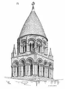 Le couronnement du clocher, formé d'une flèche à écaille dite « en pomme de pin » s'inspire des monuments funéraires de l'Antiquité.