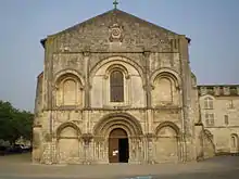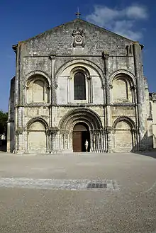 La façade occidentale est caractéristique du style roman saintongeais. Cette façade-écran tripartite, bien que mutilée lors des guerres de religion et sensiblement modifiée durant la campagne de restauration des années 1924-1939, conserve notamment un portail à quatre voussures. Les claveaux montrent les vieillards de l'apocalypse, les rois de l'ancien testament – dont David, reconnaissable à sa harpe – ou encore des représentations animalières (lions, oiseaux, dont deux buvant dans une coupe, probable allusion à l'eucharistie). La seconde voussure est ornée des symboles des quatre évangélistes entourant l'agneau pascal, symbole christique.