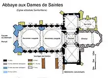 L'abbaye aux Dames se structure autour de l'église Sainte-Marie, érigée au XIIe siècle. Célèbre pour sa façade et son clocher caractéristique « en pomme de pin », elle est un des monuments emblématiques du roman saintongeais. Les bâtiments conventuels, de style classique, datent du XVIIe siècle. Ils ont été relevés par l'abbesse Françoise de Foix, après avoir durement souffert des guerres et de plusieurs incendies.