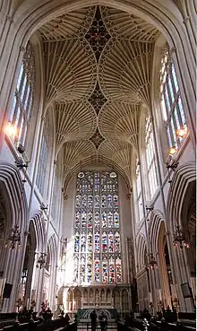 Lorsqu'Oliver King (en), évêque de Bath et Wells de 1495 à 1503, visita Bath en 1499, il fut choqué de découvrir cette célèbre église en ruines. Il décrivit également la discipline laxiste, l'oisiveté, et un groupe de moines "tous trop désireux de succomber aux tentations de la chair". Il lui fallut un an pour examiner les mesures à prendre, avant d'écrire au prieur de Bath en pour lui expliquer qu'une grande partie des revenus du prieuré serait consacrée à la reconstruction de la cathédrale. Les travaux commencèrent probablement le printemps suivant. L'évêque King conçut une église plus petite, couvrant seulement la surface de la nef normande. Il ne vécut pas assez longtemps pour voir le résultat, mais la restauration de la cathédrale fut achevée quelques années seulement avant la dissolution des monastères en 1539. La nouvelle église n'est pas un exemple typique de la forme perpendiculaire qui caractérise l'architecture gothique anglaise ; les allées basses, les arcades de la nef et le très grand triforium sont à l'opposé de ce que l'on trouvait habituellement dans les églises perpendiculaires. Comme cet édifice devait servir d'église monastique, il fut construit selon un plan cruciforme, ce qui était devenu relativement rare dans les églises paroissiales de cette époque. À l'intérieur, se trouvent de belles voûtes en éventail, conçues par Robert (en) et William Vertue (en), qui dessinèrent des voûtes similaires pour la chapelle de Henry VII, à l'abbaye de Westminster. Le bâtiment est composé de 52 fenêtres qui occupent environ 80 % de l'espace mural et qui donnent à l'intérieur une impression de luminosité, elles reflètent les différentes positions du clergé de l'époque et du XIIe siècle à l'égard du monde ecclésiastique.