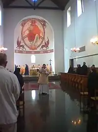 - L'église latine a été construite ensuite, entre 1981 et 1988. Elle est construite sur un plan basilical (narthex, nef et sanctuaire). Sa construction est aussi un symbole d'unité des chrétiens puisque la première pierre, provenant du Mont Sion à Jérusalem, a été posée le par l'archevêque de Cantorbéry et chef spirituel de la Communion anglicane, Robert Runcie, et le cardinal Godfried Danneels, archevêque de Malines et primat catholique de Belgique. Les architectes de l’église latine sont Eric Itschert et Roland Van Eyck [7]. De plus, l'église est ornée de deux fresques d’inspiration romane dues au moine iconographe russe orthodoxe, l'archimandrite Zénon[8].
