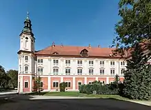 Le bâtiment du monastère a été créé dans le style baroque entre 1681 et 1702. Dans la seconde moitié du XIXe siècle, il a été reconstruit et changé en bâtiment quadrilatéral. Il est situé autour de la cour rectangulaire avec l’aile sud avancée. Trois portails baroques mènent à l’intérieur qui contient environ 300 pièces. Il y a le portail juridique avec un personnage de Thémis, le portail monastique avec Saint Bernard et le portail d’abbaye avec le blason de l’abbé. Au rez-de-chaussée, il y a un réfectoire baroque, et au premier étage il y a les salles représentatives : la salle de Prince, la salle Pourpre, la salle de Chêne et la salle de Pape. La salle de Chêne a le parquet marqueté et la boiserie décorée de guirlandes végétales (l’ensemble est fait par les sculpteurs sur bois d’Henryków). La salle Pourpre, où on recevait les visiteurs importants, avait les murs et les revêtements des meubles pourpres et la cheminée de marbre. Dans la salle, il y a six tableaux de Willmann qui présentent les fondateurs de l’abbaye. Dans le réfectoire, il y a un poêle décoratif de rococo, en plusieurs couleurs (chaque tuile est peinte à la main), et les bancs en chêne du XVIIIe siècle. La chapelle de séminaire est décorée des boiseries renaissances.