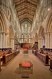 Au-dessus de la crypte saxonne, construite en pierres provenant du campement romain de Corstopitum (Corbridge), se dresse un chœur de style gothique primitif avec d'imposants transepts. Du transept sud, un escalier de pierre baptisé Night Stair (l'escalier de la nuit) mène à l'ancien dortoir des chanoines. La Leschman Chantry (chantrerie datée de 1491) est ornée, à la base, de sculptures de pierre et, au sommet, de boiseries délicatement travaillées.