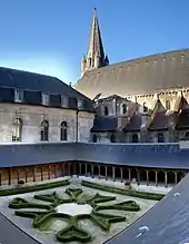 Le cloître lui-même, dont on ignore l'aspect primitif, avait complètement disparu et a été reconstitué lors de la restauration récente. Il est bordé à l'ouest par l'ancien logis des abbesses, construction en pierre du XVIIIe siècle. Au sud, une construction du XVe siècle ou du début du XVIe siècle, en pierre et silex taillés, comprenait au rez-de-chaussée, le réfectoire, et à l'étage, un dortoir avec cellules qui a conservé une charpente du XVIe siècle en châtaignier. Du côté est, dans le prolongement du transept sud de l'abbatiale, l'ancien chapitre, ou salle capitulaire, est une salle voutée qui remonte au XIe siècle. À sa suite, sur le même côté, se trouve l'ancien réfectoire, vaste salle du XIIIe siècle de style gothique. Les voûtes d'ogives reposent le long des murs sur des colonnettes appliquées, avec chapiteaux à crochets, et, au centre, sur une file de colonnes rondes.