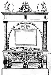 Après la translation de 1552, Henri II, roi de France fit élever un mausolée pour Louis le Pieux dans la nouvelle abbatiale, du côté de l'épître. Le nom du sculpteur n'est pas connu mais un dessin du XVIIIe siècle permet d'en apprécier la majesté. Il s'agit d'un tombeau-effigie, aux formes verticales dominantes, tombeau grandiose qui répond au goût du XVIe siècle. Moins grand que les tombeaux royaux renaissants de Saint-Denis, le monument se devait de célébrer la gloire impériale carolingienne dont le Valois se voulait l'héritier. Le gisant de Louis le Pieux est couché directement sur la dalle-couvercle et occupe quasiment toute la longueur du sarcophage antique incorporé dans le nouvel arrangement. L'empereur est couronné, il tient le sceptre dans la main droite ; sa tête est appuyée sur un coussin, les pieds se dressent sans appui. Deux colonnes engagées ou adossées reposent sur la dalle-couvercle ; elles supportent un couronnement qui termine harmonieusement le tout. La partie inférieure du tombeau est constituée du sarcophage antique, amplifié par des pilastres ou des colonnes cannelées, disposées latéralement, agrémentées de coquilles et de cartouches. La cuve repose sur trois protomés de lion à tête anthropomorphe. Les lions tiennent entre leurs pattes des écussons bipartites avec lys royal et aigle impérial[7]. Une partie du tombeau de Louis le Pieux se trouve aux musées de Metz, le reste du monument funéraire ayant été détruit pendant la Révolution.
