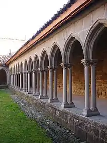 Il a été édifié au XIVe siècle en forme de trapèze irrégulier avec quatre galeries. Elles sont composées d'arcades ogivales et moulurées à colonnettes jumelées. Les chapiteaux taillés dans un seul bloc de pierre sont décorés de feuillages, de visages humains ou d'animaux. La pierre utilisée est le grès qui provient des carrières du Razès. Le centre du cloître comporte un bassin quadrilobe avec en son centre une vasque datant du XVIe siècle ainsi qu'un puits. Le cloître est classé monument historique par la liste de 1846[4].