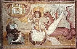 - Saint Jean, assis à gauche, voit apparaître dans le ciel l'Arche d'alliance dans son sanctuaire. Il voit aussi une femme qui va donner le jour à un garçon. Un dragon rouge ayant sept têtes et dix cornes attend que l'enfant naisse pour le dévorer mais un ange le prend et l'emmène en sécurité dans le ciel. Pour se venger, le dragon vomit un fleuve afin de noyer la femme mais la terre engloutit le fleuve. Pour échapper au dragon, la femme est munie des ailes de l'aigle et va se réfugier dans le désert. Cette scène est tirée de l'Apocalypse de Saint-Jean[B 1] ;