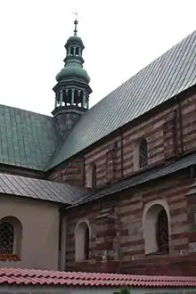 Si la décoration de l'église, les ouvertures et l'ornementation ont beaucoup évolué, le plan de l'église est resté très fidèle à l'idéal cistercien : nef de quatre travées, entouré de bas-côtés, transept de trois travées carrées, chevet plat à triplet de lancettes, chapelle latérale de chaque côté du chœur ; chœur, transept et nef sont dotés de voûtes d'égale hauteur. La nef est éclairé par les verrières hautes, situées au-dessus de la toiture des bas-côtés, ainsi que par les verrières situées dans les murs de ces derniers. Une grande rose orne le mur de façade occidentale, ainsi que deux fenêtres donnant sur les bas-côtés, mais qui ne sont probablement pas d'époque et datent vraisemblablement de la restauration du XIXe siècle[10]. L'église originelle ne possède pas de clocher, mais seulement un clocheton de bois placé sur la croisée du transept, depuis remplacé par un clocher baroque[8]. Comme dans d'autrs abbayes cisterciennes de Petite-Pologne (Jędrzejów (de) et Koprzywnica (de), Sulejów et Mogila), l'influence architecturale italienne est visible dans l'utilisation de l'opere italico, alternance de lits horizontaux de pierre rouge et de grès gris[13]. Cet étagement est conçu de manière à équilibrer les lignes verticales de l'édifice par la création de lignes horizontales, ainsi qu'à donner l'illusion d'un plus grand allongement de l'église ; on retrouve l'application de cette technique dans le cordon partageant toutes les élévations internes en deux zones[11].