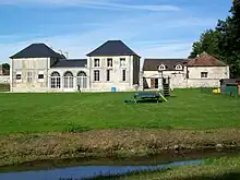 La « maison des moines », les bâtiments de la ferme de l'abbé et les communs de l'abbaye avec notamment l'orangerie[53] ne manquent pas d'intérêt architectural. On trouve cet ensemble à l'ouest du château, l'orangerie étant orientée sur les étangs avec sa façade principale, et le portail de la cour de la ferme vers Villemétrie.