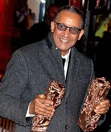 Abderrahmane Sissako avec deux de ses trois trophées remportés lors des César 2015.