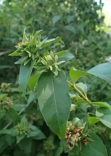 C'est un arbuste à feuilles semi-persistantes, mesurant jusqu'à 2 m de haut, très ramifié. Les jeunes branches sont fines et pubescentes. Les feuilles sont opposées, parfois en verticilles de trois ; le limbe foliaire est ovoïde, de dimensions 2-5 × 1-3,5 cm, abaxialement peu pubescent, aux villosités d'un blanc dense à la base des nervures médianes et latérales, à base arrondie ou cordiforme, au bord lointain crénelé-serré, d'un apex aigu à long acuminé[3].